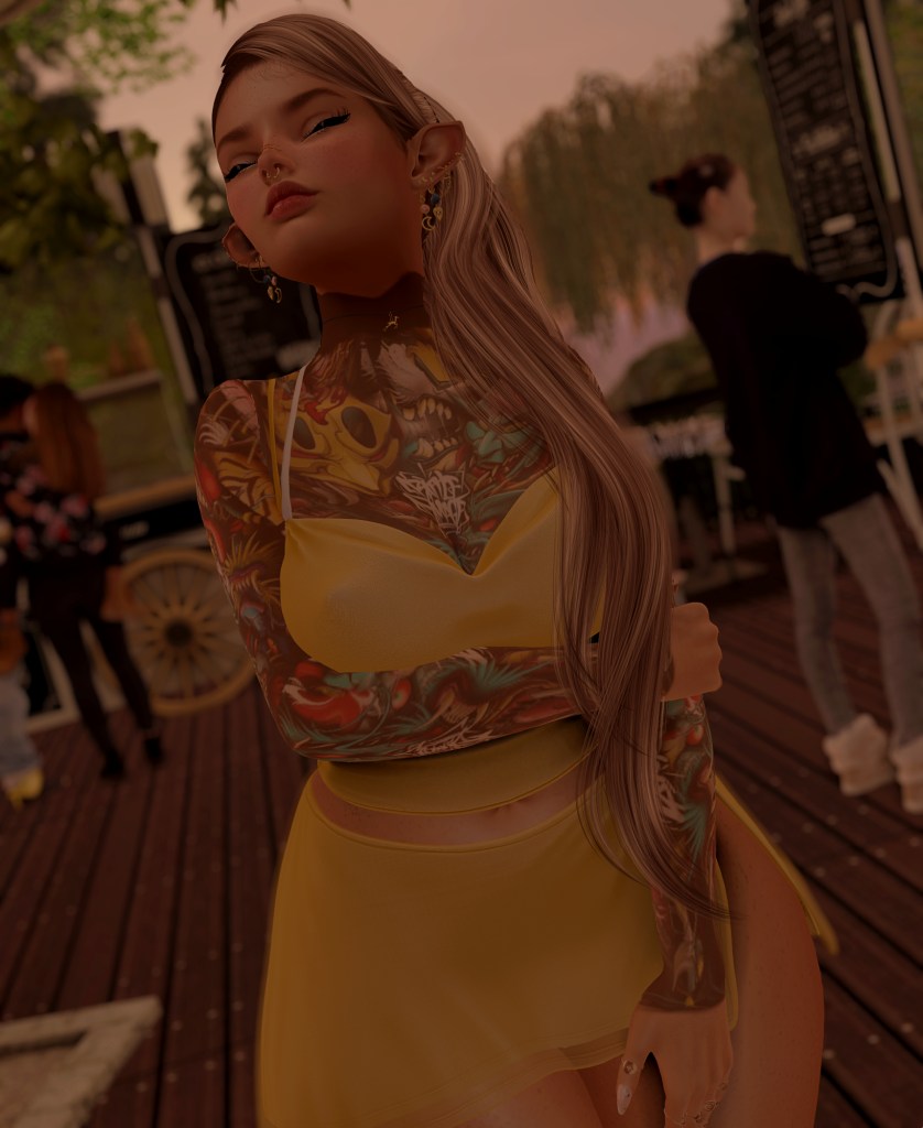– It is a unisex tattoo, that covers the full arms, chest, back and neck. It is BoM with evoX and it comes in 3 versions, dark, mid and light. I am wearing the mid version here, and included a second photo to show off the sleeves that can’t be seen well with the Cynful shrug on.